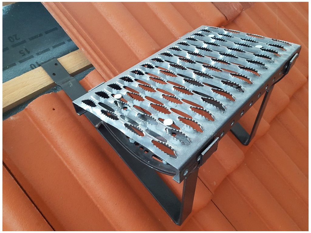 Inštalácia podpier. Na pripravené pomocné laty namontovať v maximálnej vzájomnej vzdialenosti 40 cm (80 cm) ukotvenia a podpery stúpacej plošiny vrutmi do dreva 8 x 60. Prekryť škridlami a vzájomne pevne zoskrutkovať. Škridly je potrebné na spodnej strane upraviť karbobrúskou.