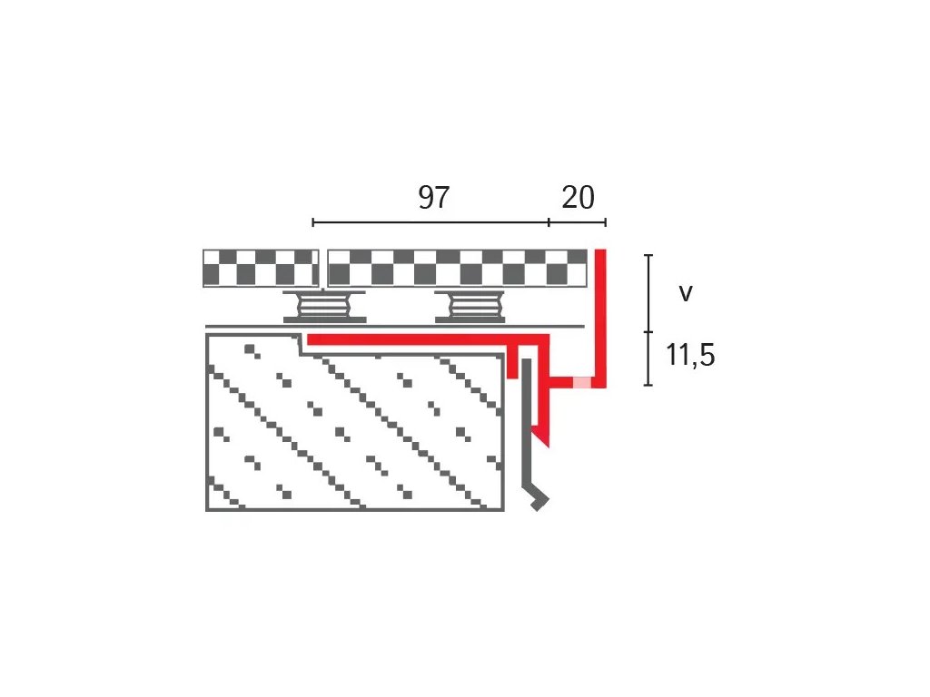 Balkónový profil RT+ 30 mm s použitím nadstavca RT+ sa aplikuje na výšku od 30 do 60 mm. Je určený na prekrytie medzery medzi dlažbou a podlahou terasy,