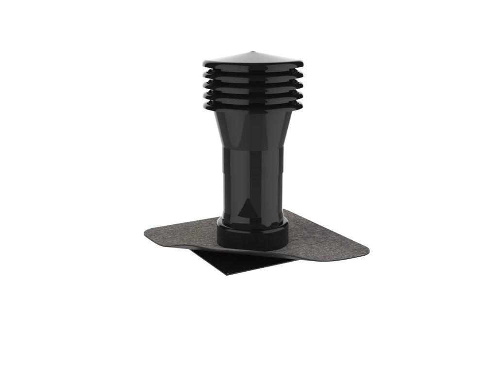 Strešný odvetrávací komín TOPWET s integrovanou manžetou z modifikovaného asfaltového pásu, vrátane dažďovej krytky.