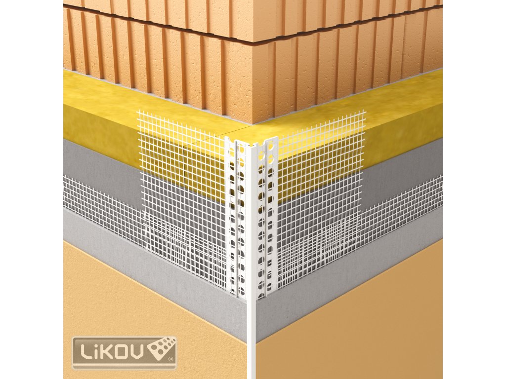 PVC lišta rohová s viditeľnou hranou LK-VH 2,5 m so sklovláknitou výstužnou sieťkou pre spevnenie a ochranu všetkých rohov, hrán a ostenia okien alebo dverí v kontaktnom zatepľovacom systéme – ETICS.