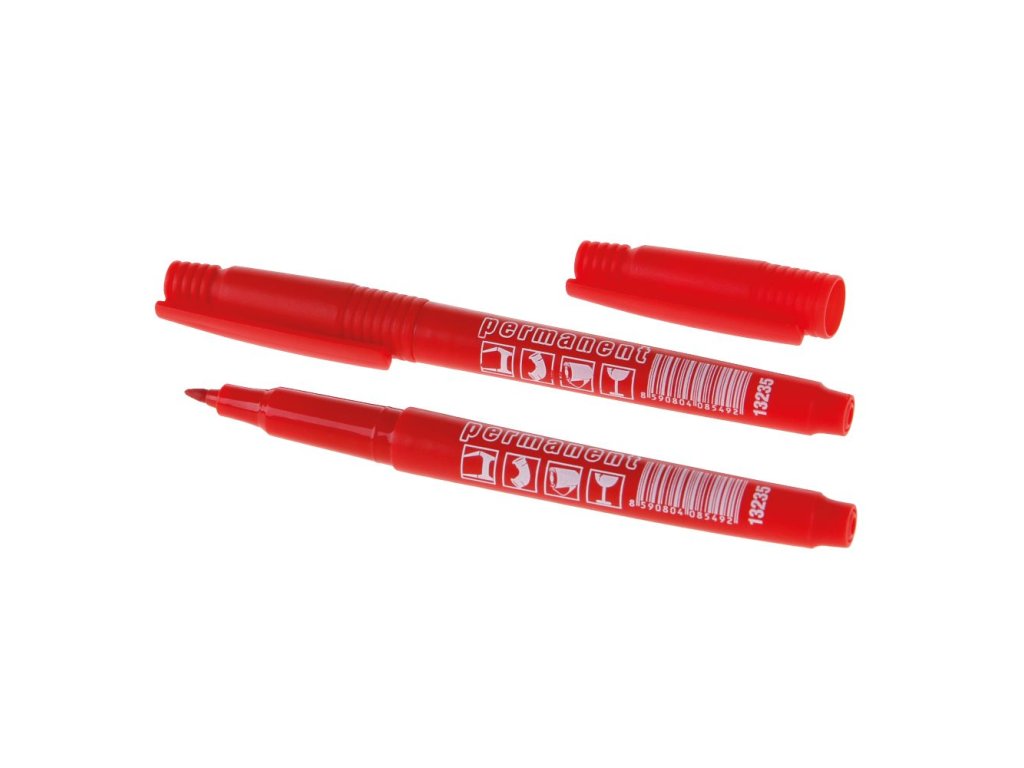 Permanentný liehový značkovač červenej farby s tenkým hrotom.
